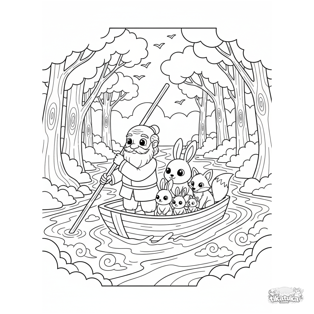 Ausmalbild für Kinder: Ein freundlicher Fährmann setzt Tiere über einen Fluss in einem alten Wald. Eine ruhige und freundliche Szene, geeignet für Kinder von 5-9 Jahren.