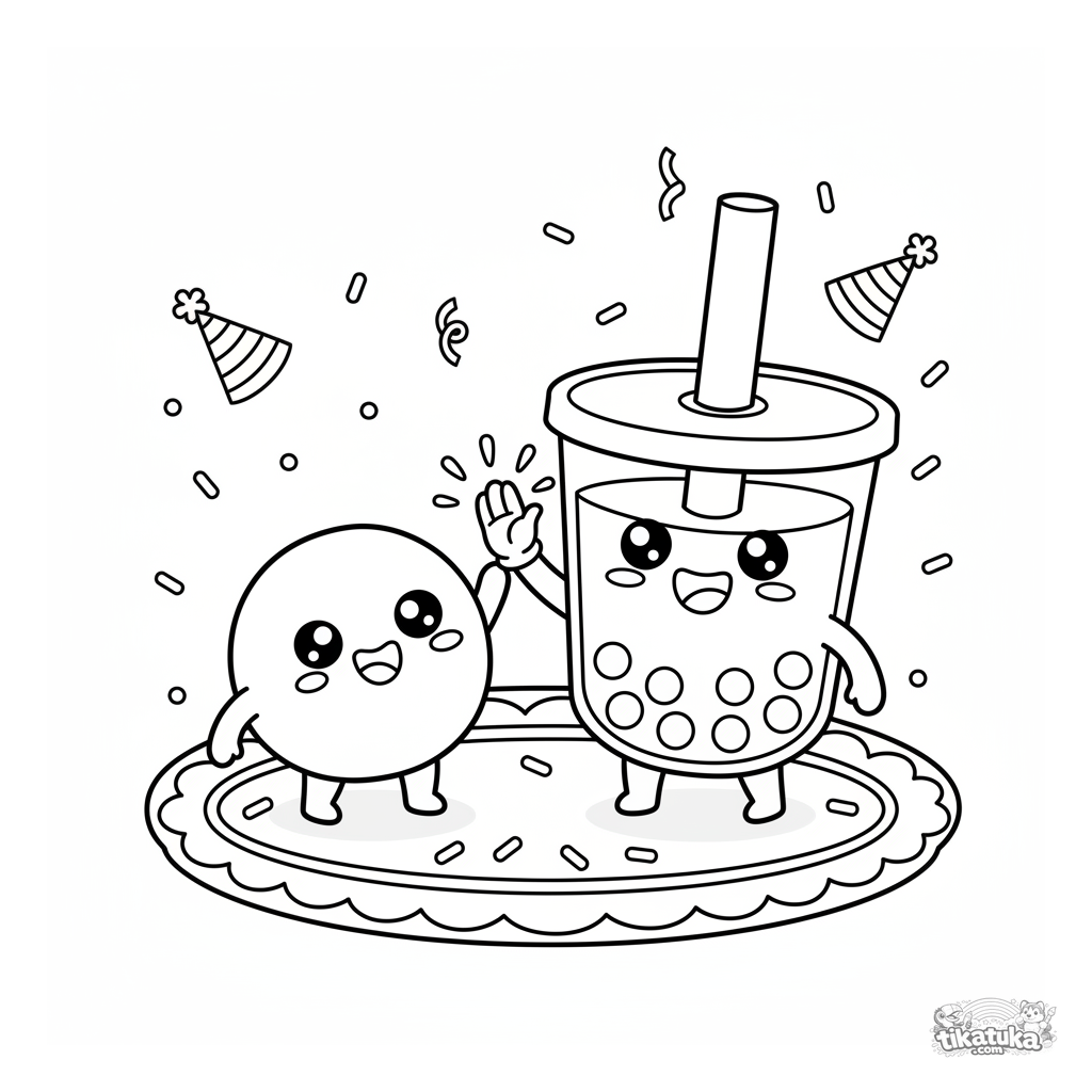 Ausmalbild: Ein Boba-Becher und eine Mochi-Kugel feiern auf einem Dessertteller. Lustige Szene mit Streuseln und einer Partyhut. Für 4-6 Jahre.