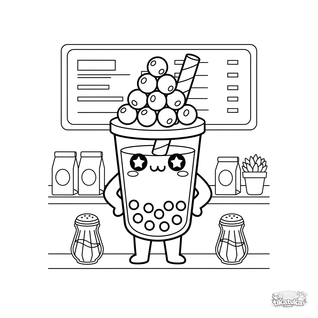 Ausmalbild eines Boba-Bechers, der Tapioka-Perlen auf einer Café-Theke balanciert. Für Kinder von 4-6 Jahren. Mit breitem Strohhalm, Zuckerstreuern und einer Menütafel.