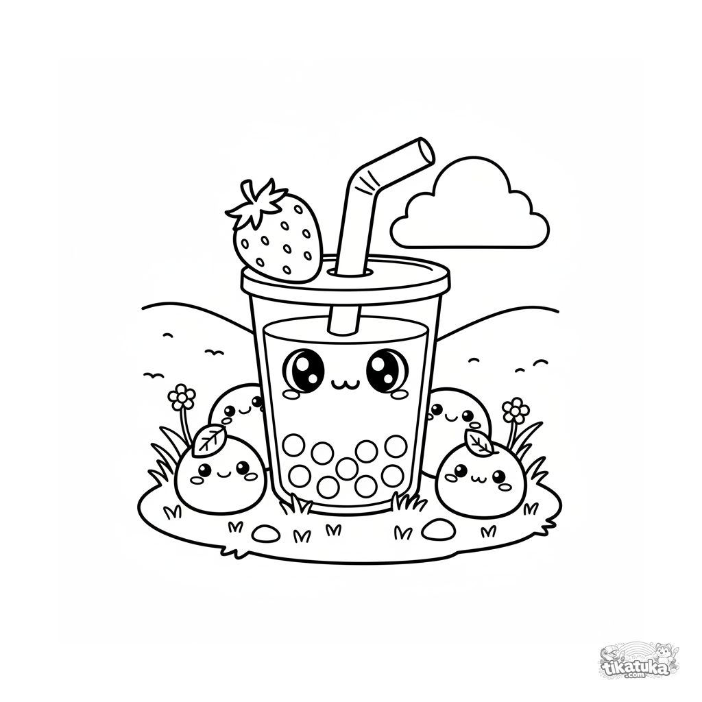 Ausmalbild für Kinder 4-6: Ein Boba-Becher spielt Verstecken hinter einem riesigen Erdbeer-Mochi. Lustige Szene mit Details.