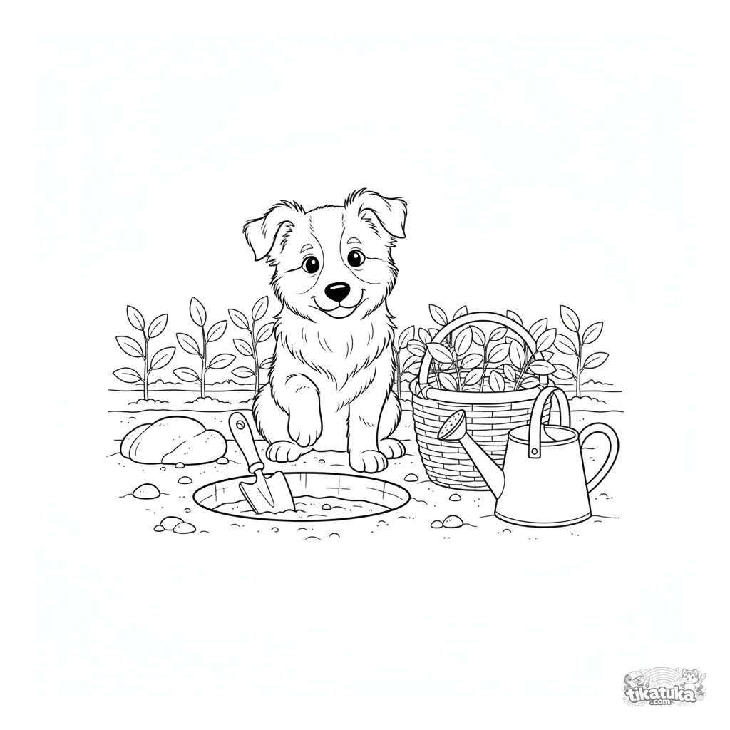 Kinder Ausmalbild: Ein flauschiger Border Collie Welpe hilft im Frühlingsgarten, sitzt neben einem Pflanzloch mit Gartengeräten. Klare Umrisse, süße Szene.