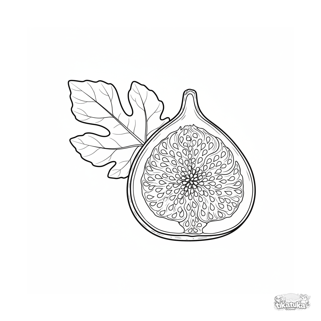 Detailliertes botanisches Ausmalbild eines Feigen-Querschnitts. Für Kinder von 10-12 Jahren. Realistischer Feld-Guide-Stil, lehrreich.