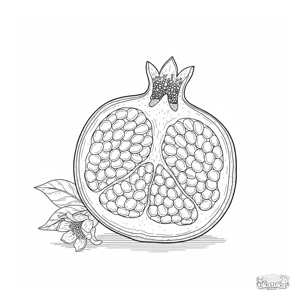 Lehrreiches Ausmalbild für 10-12 Jahre: ein detaillierter botanischer Querschnitt eines Granatapfels mit Kernen. Komplexe Umrisse zum sorgfältigen Ausmalen.