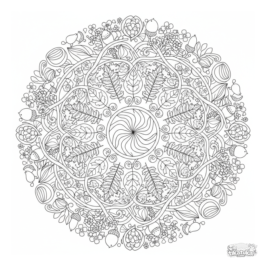 Komplexe botanische Mandala-Ausmalbild für 10-12 Jahre. Mit Farnspirale in der Mitte, Ringen aus Blättern, Ranken, Tannenzapfen und Eicheln im symmetrischen Layout.