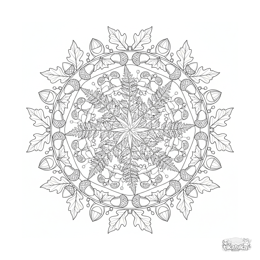 Detaillierte botanische Mandala-Ausmalbild für 10-12 Jahre. Farne, Samenkapseln, Efeu, Eicheln—ein komplexes symmetrisches Muster, inspiriert von der Natur, perfekt für geduldiges und detailliertes Ausmalen.