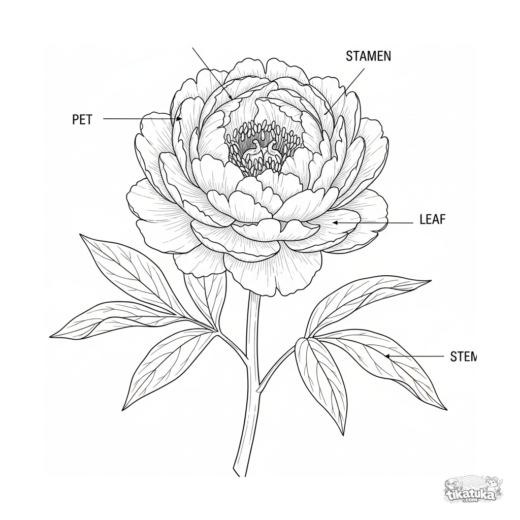 Ausmalbild für ältere Kinder: Eine detaillierte botanische Illustration einer Pfingstrose mit beschrifteten Blütenteilen. Hohes Detaillierungsniveau, pädagogischer Stil.