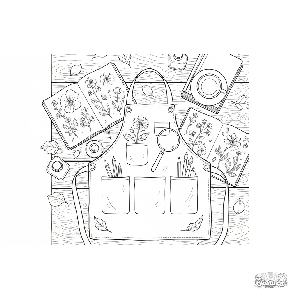 Ausmalbild für Mädchen 10-12: Eine detaillierte Flachlage einer botanischen Illustratorin-Schürze und Werkzeuge, auf einem Holzschreibtisch zwischen Skizzen und Pflanzen arrangiert.