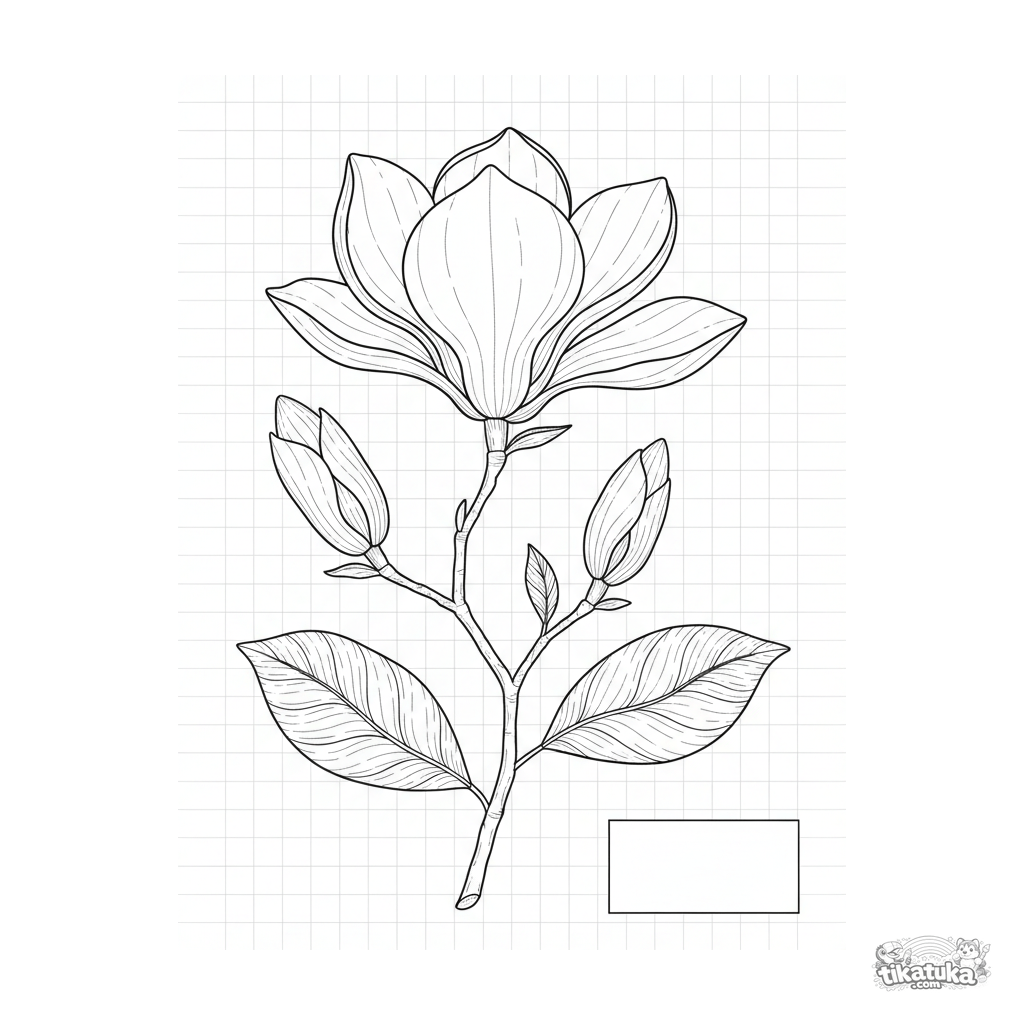 Detailliertes Ausmalbild für Kinder 10-12: Ein Magnolienzweig als botanisches Presspräparat. Präzise Linien, Texturen, pädagogischer Stil.