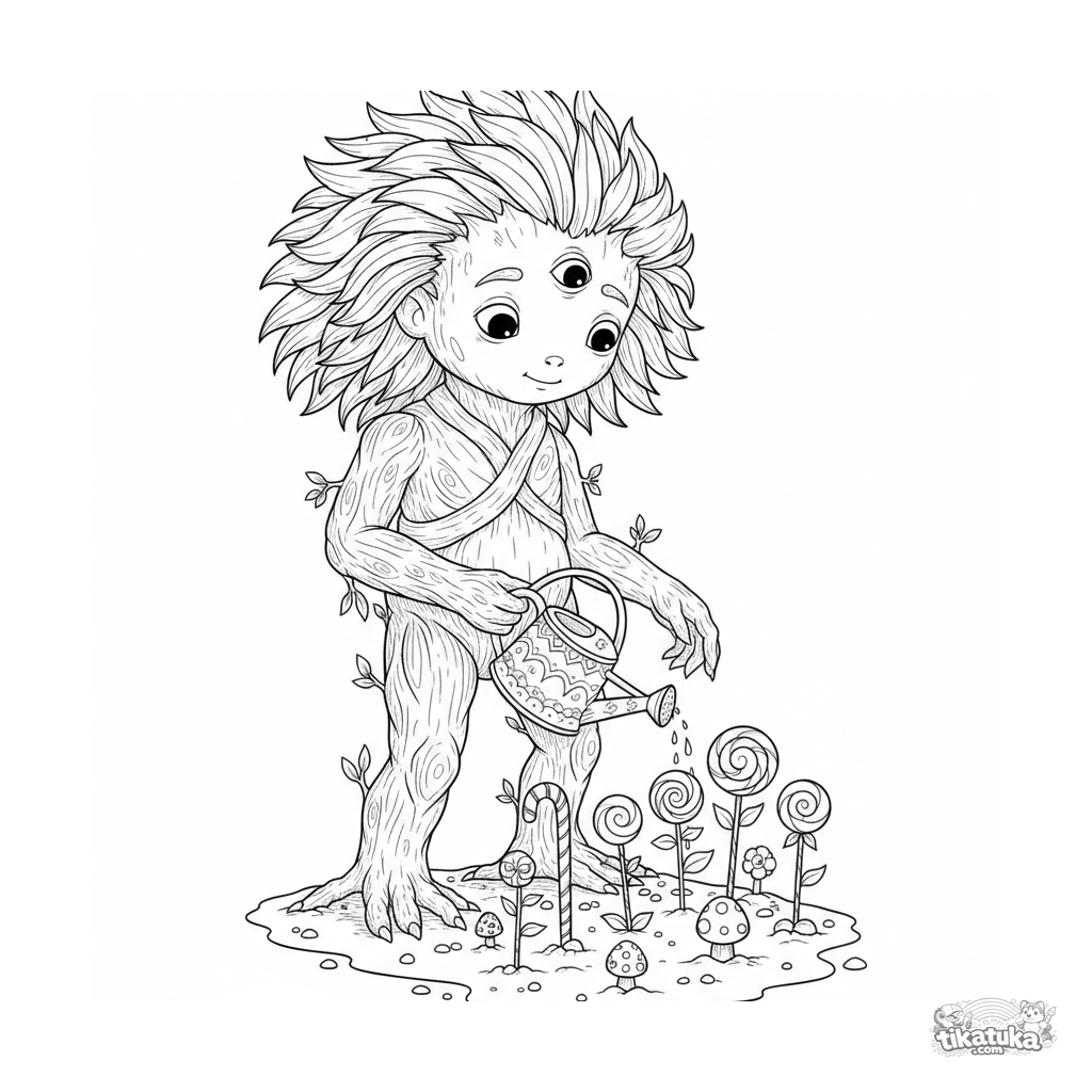 Detailliertes, realistisches Ausmalbild: Ein botanisches Monster pflegt einen Zuckerstangengarten bei einem Picknick. Für Kinder von 10-12 Jahren.