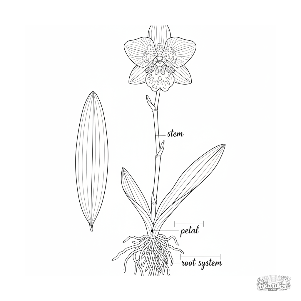Ausmalbild für Kinder 10-12: Eine detaillierte botanische Zeichnung einer Orchidee mit beschrifteten Pflanzenteilen. Lehrreiche und präzise Szene.