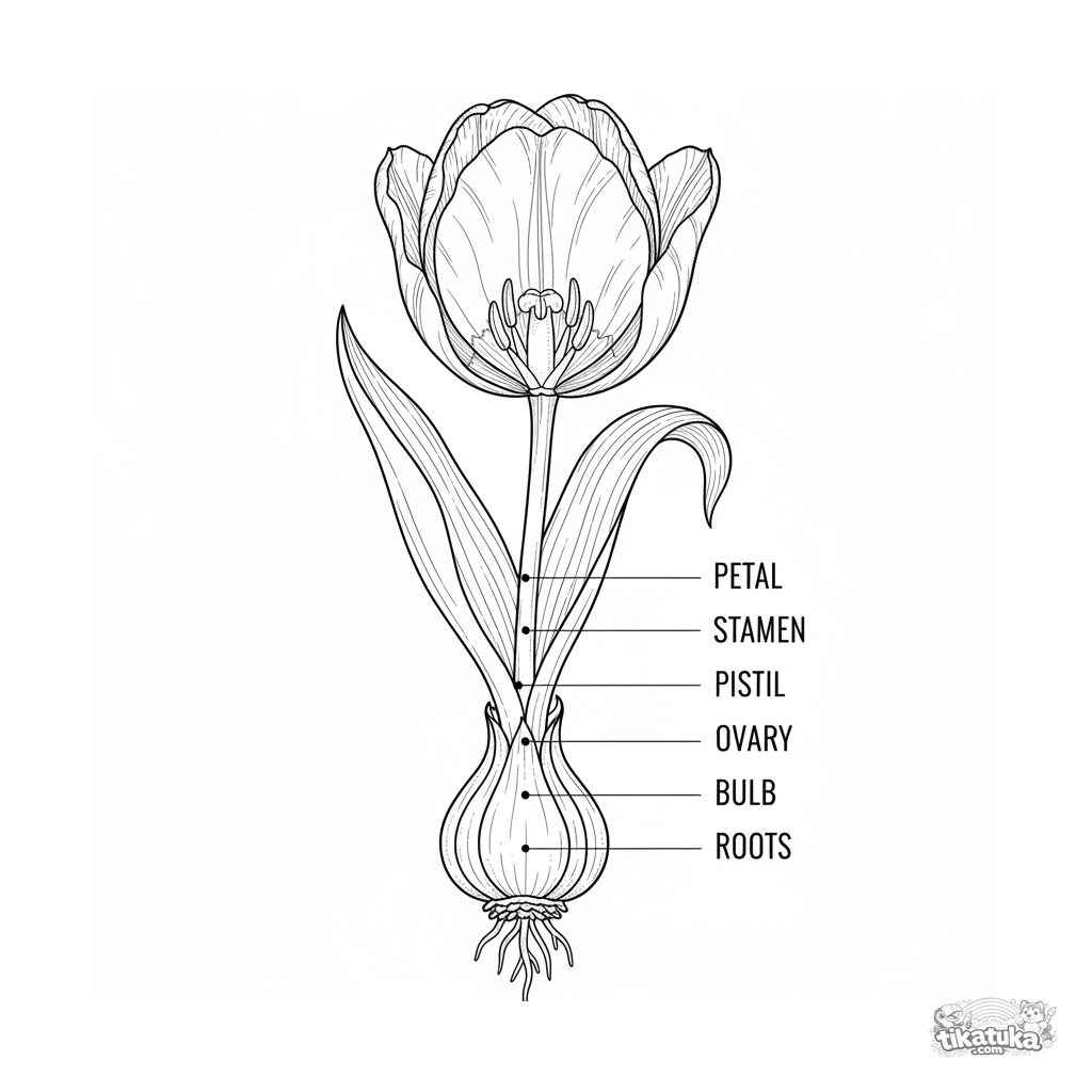 Detailliertes Ausmalbild für 10-12 Jahre: Eine Tulpe im botanischen Querschnitt mit beschrifteten Teilen. Lehrreiche und präzise Illustration.