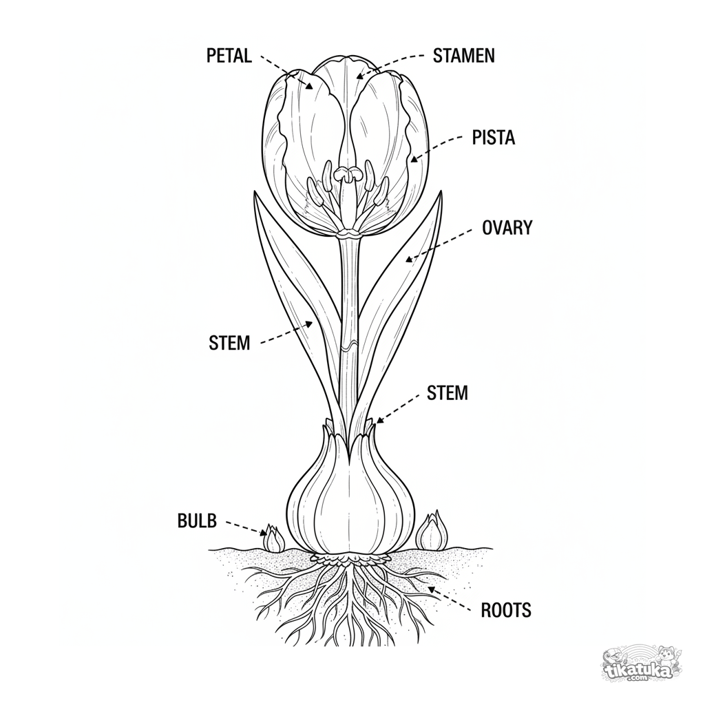 Detailliertes Ausmalbild für 10-12 Jahre: eine botanische Querschnittszeichnung einer Tulpe. Zeigt Blüten-, Stängel- und Zwiebelstruktur.