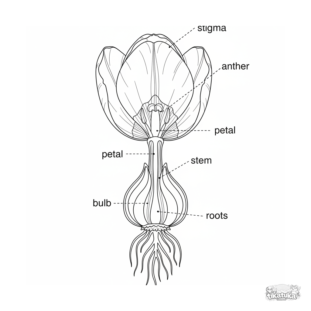 Lehrreiches Ausmalbild für Kinder 10-12: Eine detaillierte botanische Zeichnung eines Tulpenquerschnitts mit beschrifteten Blütenteilen. Wissenschaftlicher Atlas-Stil.