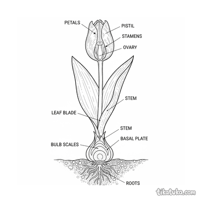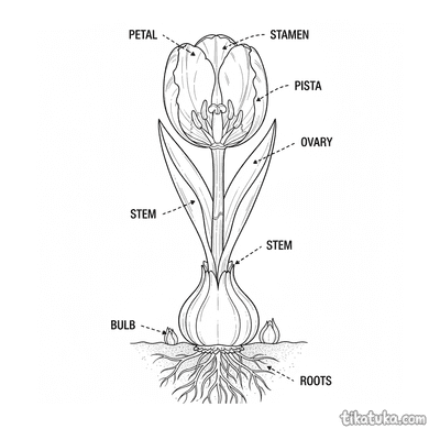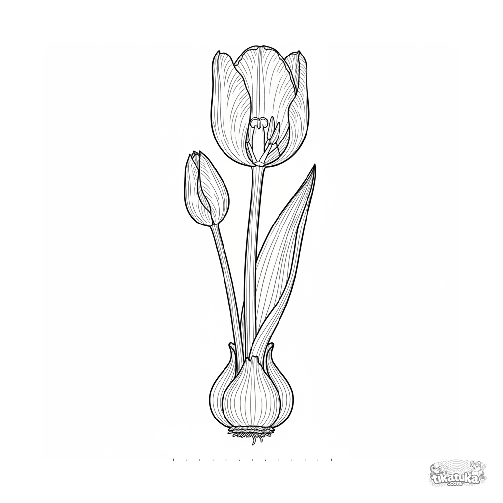 Detailliertes Ausmalbild einer Tulpe im botanischen Querschnitt für 10-12 Jahre. Zeigt innere Blütenschichten, Stängelgefäße und eine Knospe, Lehrstil.
