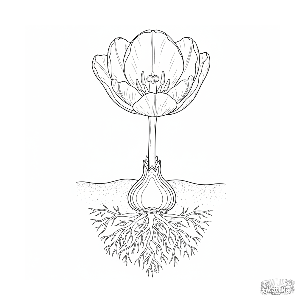 Ein detailliertes botanisches Ausmalbild einer Tulpe im Querschnitt für 10-12 Jahre. Zeigt Blütenblätter, Staubblatt, Stempel und Wurzelsystem unter der Erde, im wissenschaftlichen Feldhandbuch-Stil.