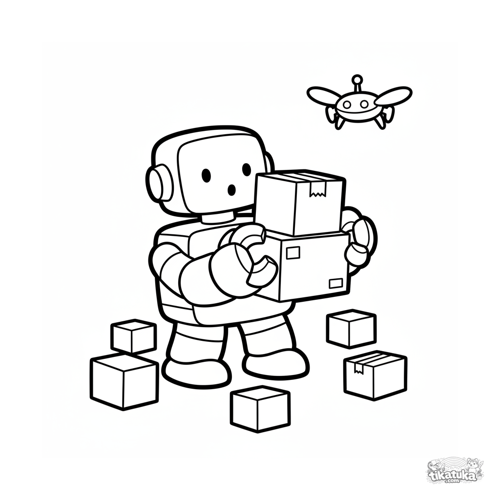 Sehr einfaches Ausmalbild für Kleinkinder 2-3: ein holzspielzeugartiger Roboter baut einen Kistenturm in einem Lagerhaus.