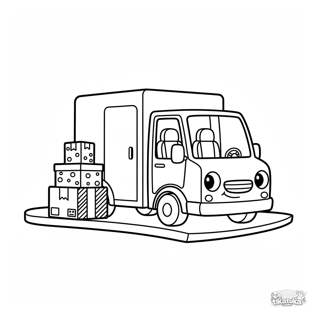 Ausmalbild für Kleinkinder von 2-3 Jahren. Ein einfacher kastenförmiger Lieferwagen mit Paketen steht am Bürgersteig.