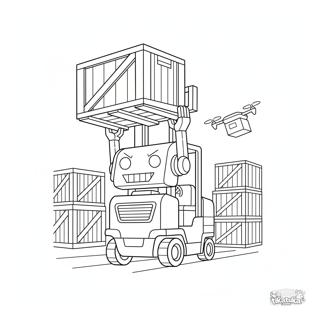 Ausmalbild für Kinder 7-9: Ein robuster Roboter-Gabelstapler hebt vorsichtig eine Kiste in einem Lagerhaus. Hintergrund mit Regalen, Kartons und Drohnen. Mäßiges Detail.