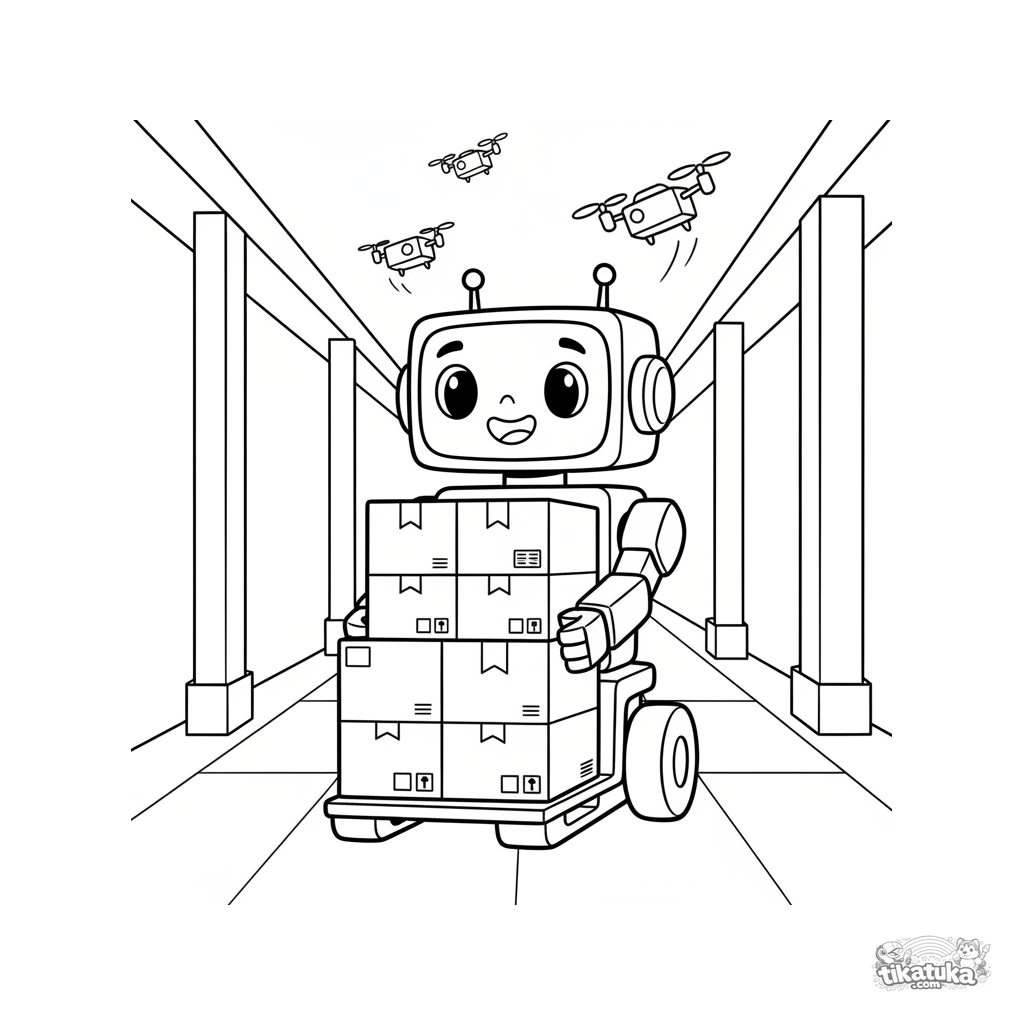 Ausmalbild eines kastenförmigen Hubwagen-Roboters, der einen Stapel Kisten durch ein Lagerhaus schiebt. Für Kinder von 4 bis 6 Jahren.