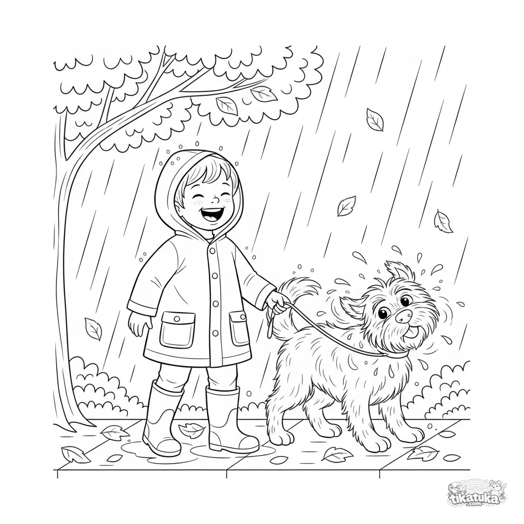 Ausmalbild für Tweens 7-9 Jahre: ein Junge in Gummistiefeln geht mit seinem Hund während eines Herbstregens spazieren.