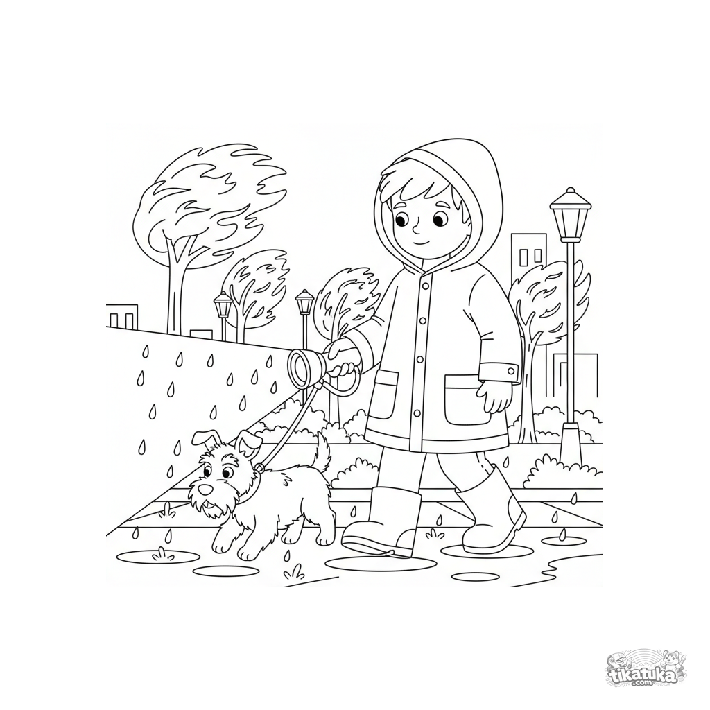 Ausmalbild für Tweens 7-9 Jahre: ein Junge mit seinem Hund und einer Taschenlampe geht durch einen Herbstguss auf einem nassen Bürgersteig. Ausdrucksstarke Posen, mäßiger Hintergrund.