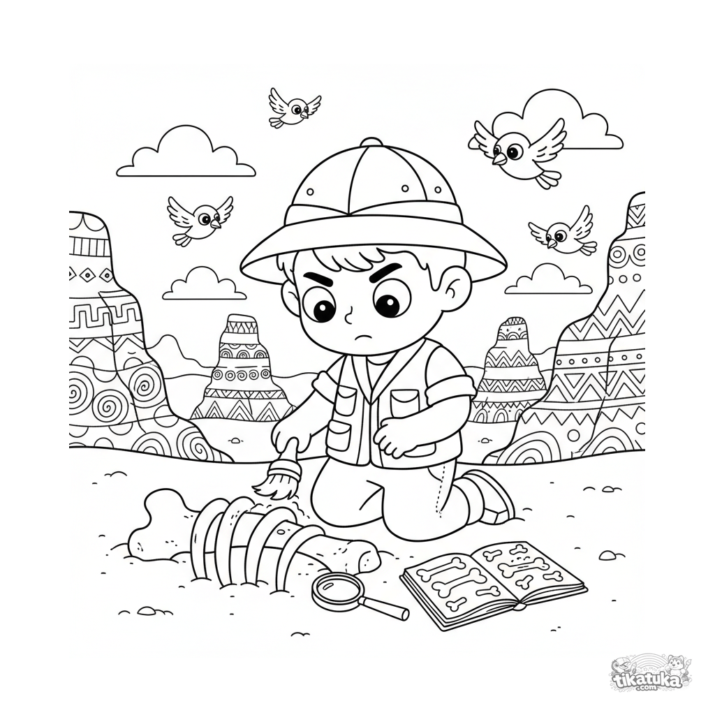 Ausmalbild eines Jungen als Archäologe, der vorsichtig einen Dinosaurierknochen putzt. Für Jungen von 6-9 Jahren.