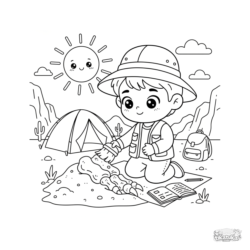 Ausmalbild eines Jungen als Archäologe, der vorsichtig ein Dinosaurier-Fossil in einem Wüstencamp putzt. Für Kinder von 5 bis 8 Jahren.