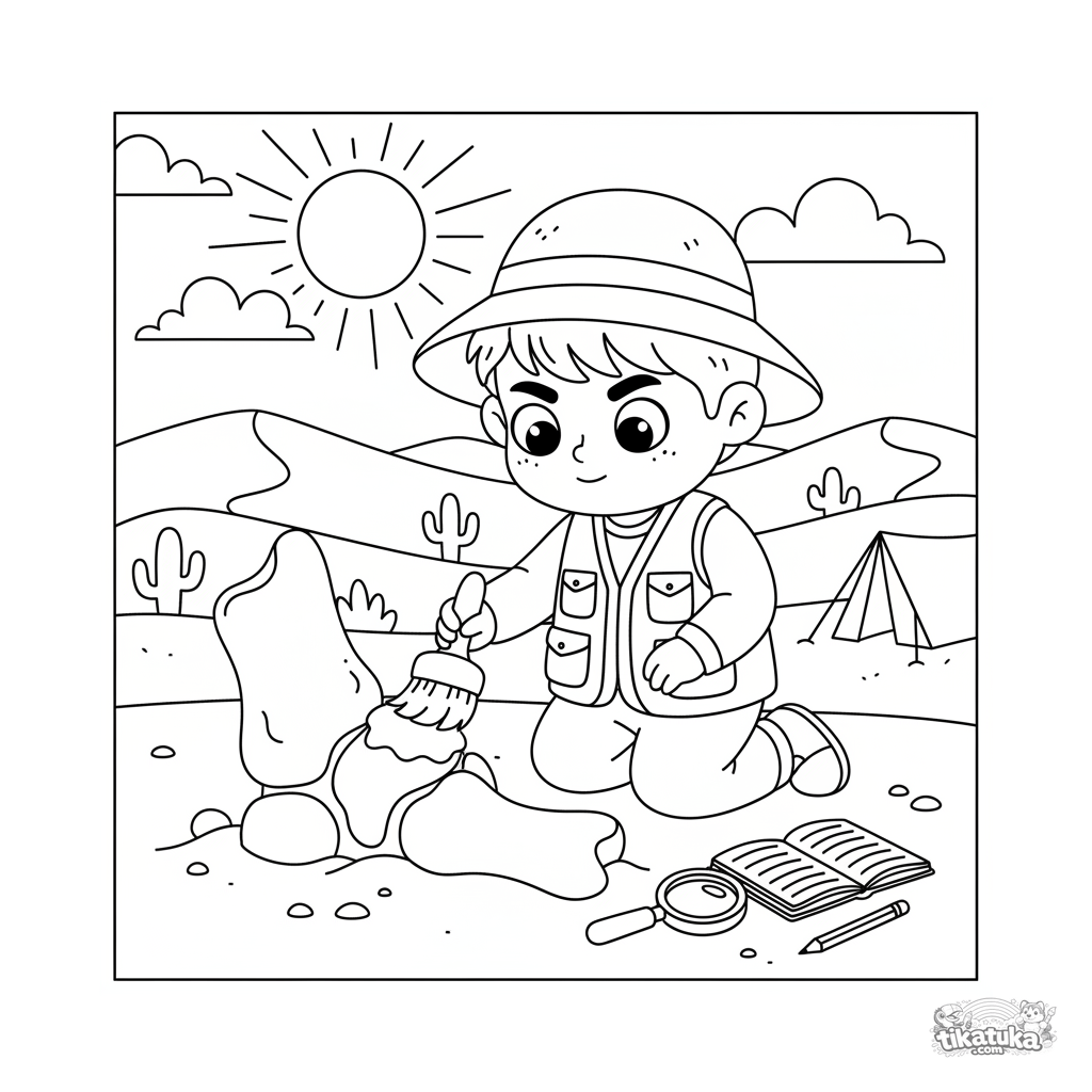 Ausmalbild eines Jungen Archäologen, der vorsichtig ein Dinosaurier-Fossil auf einer Wüstengrabungsstelle putzt. Für Jungen von 5-8 Jahren.