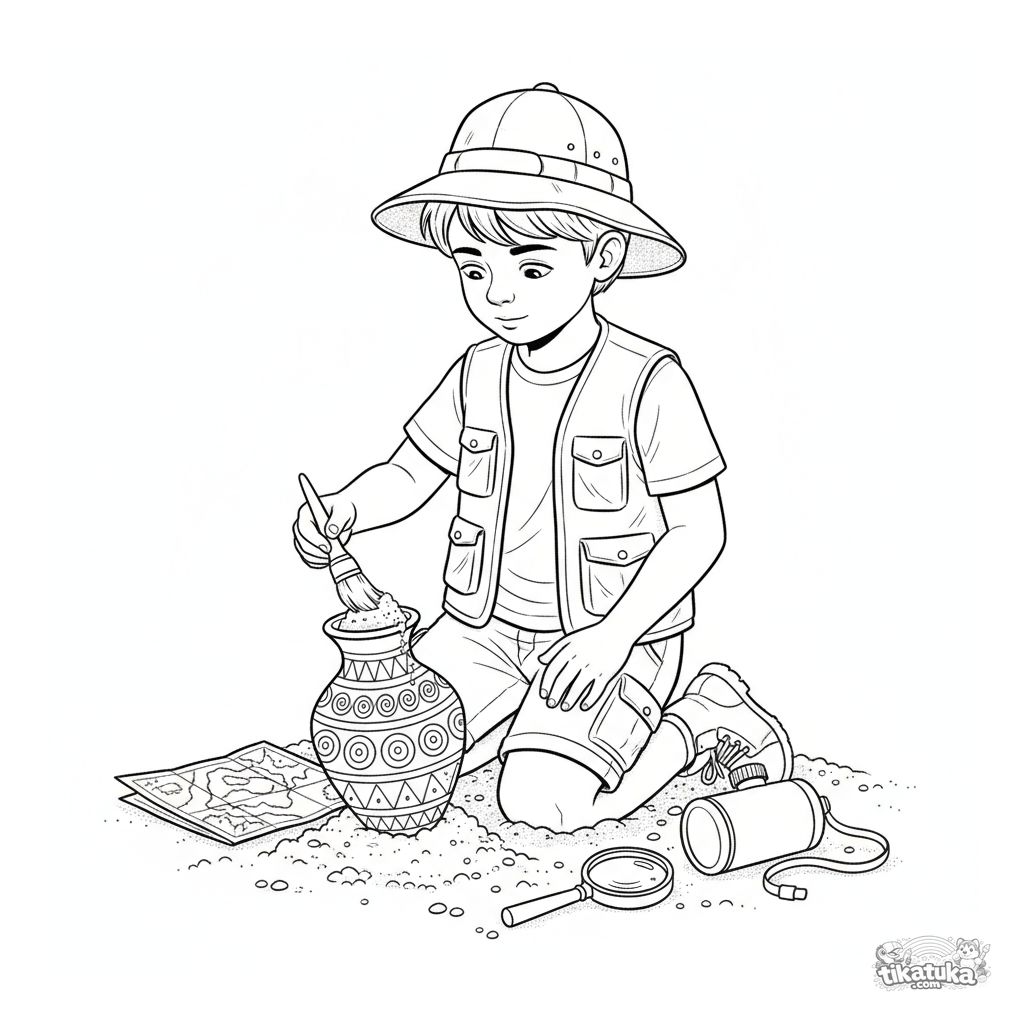 Ausmalbild eines Jungen als Archäologe an einer Ausgrabungsstätte. Für Kinder von 6-9 Jahren. Er säubert vorsichtig Sand von einer alten Vase.