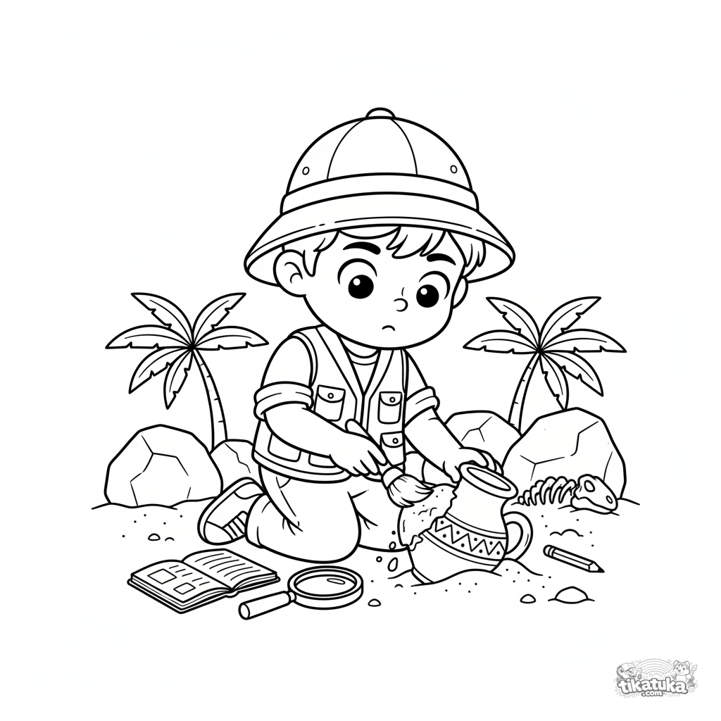 Ausmalbild eines Jungen als Archäologe, der vorsichtig Sand von alter Keramik auf einer Grabung bürstet. Für Kinder von 5-8 Jahren.