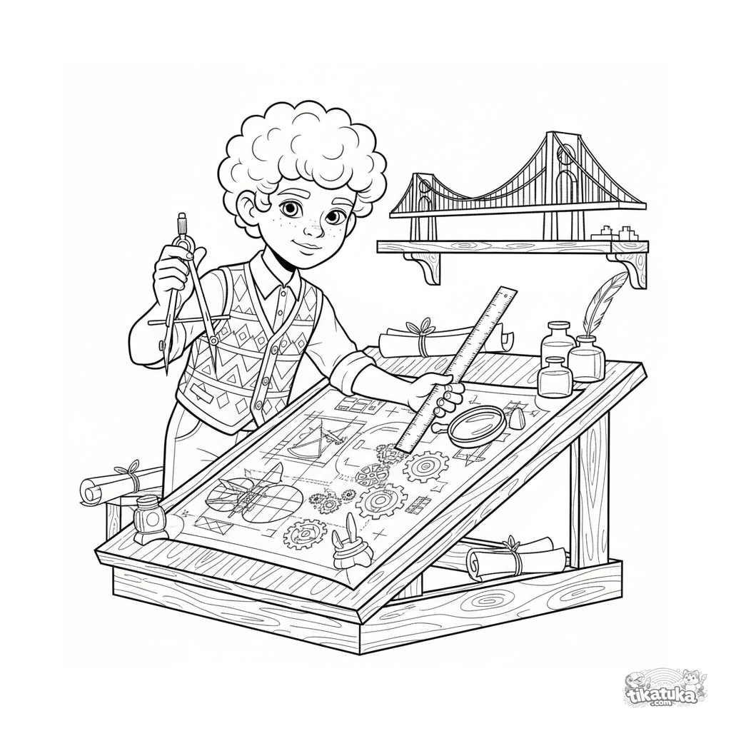 Komplexes Ausmalbild für Kinder von 10-12 Jahren: ein junger Architekt entwirft einen Bauplan für eine fantastische Maschine in einem geheimen Labor.