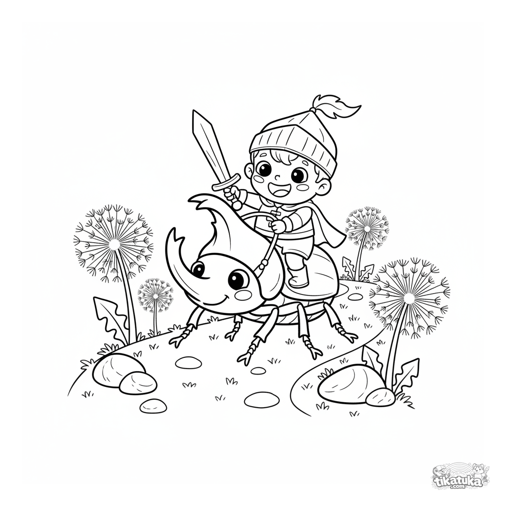 Ausmalbild eines Jungen-Ritters, der einen großen Käfer auf einem Gartenweg reitet. Für Kinder von 4-6 Jahren. Abenteuerszene mit Löwenzahn.