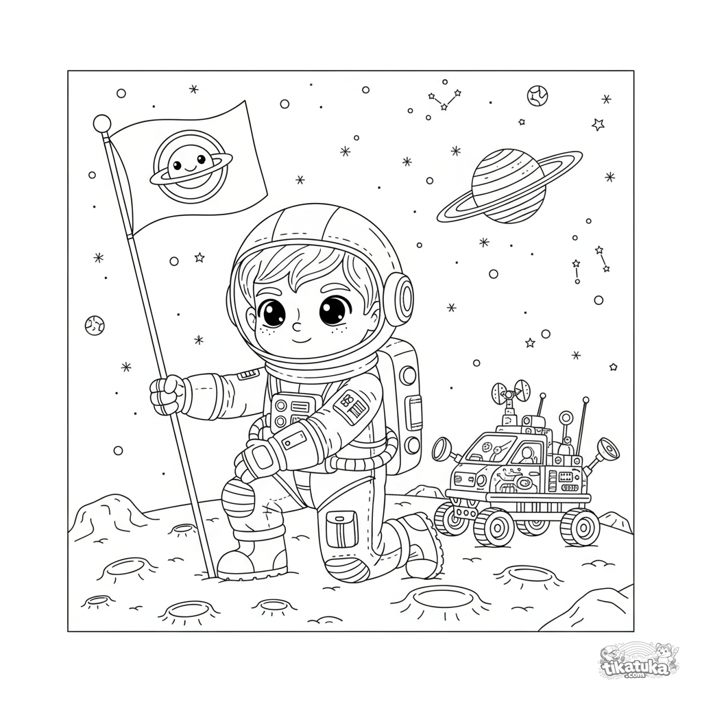 Ausmalbild eines Jungen als Astronaut, der eine Flagge auf der kraterübersäten Mondoberfläche aufstellt. Für Kinder von 6 bis 9 Jahren.