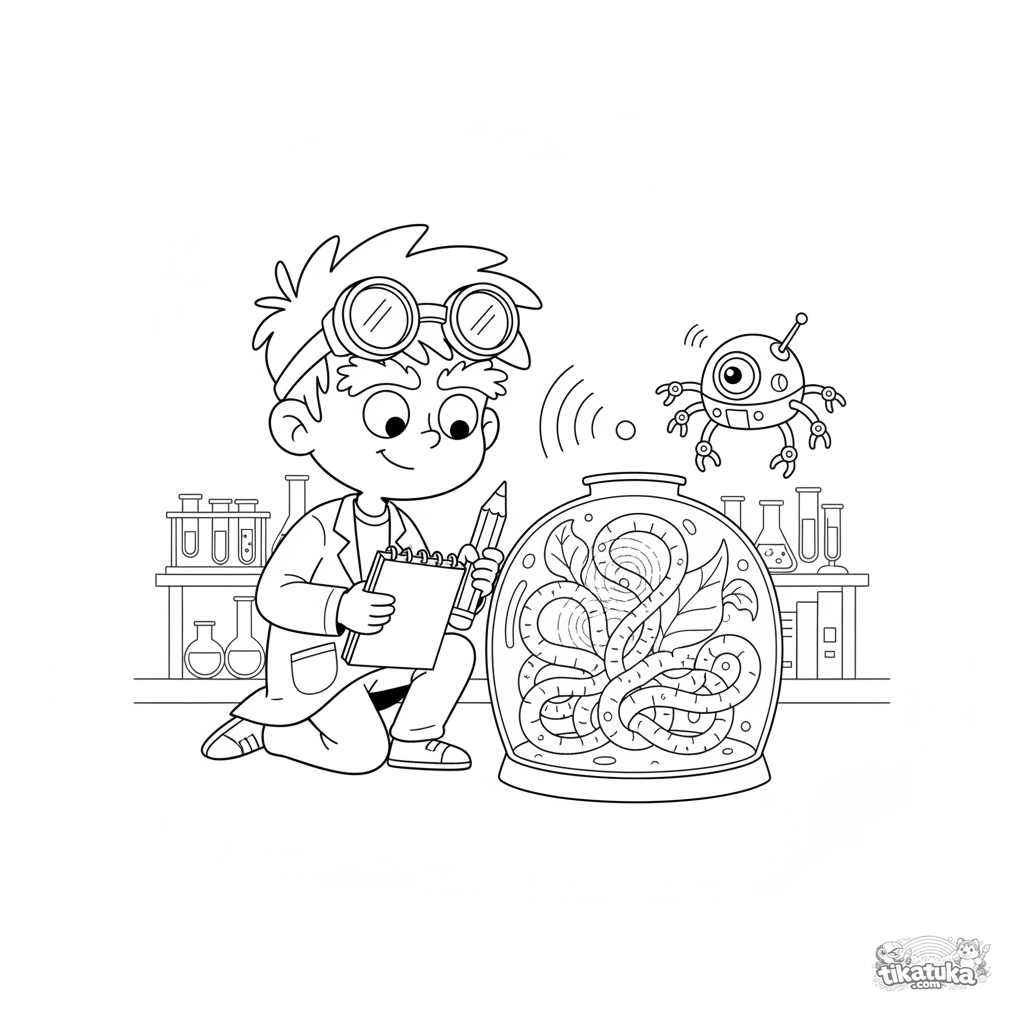 Ausmalbild für Kinder 7-9: ein junger Biologe in einem geheimen Labor studiert eine leuchtende Pflanze in einem Terrarium.