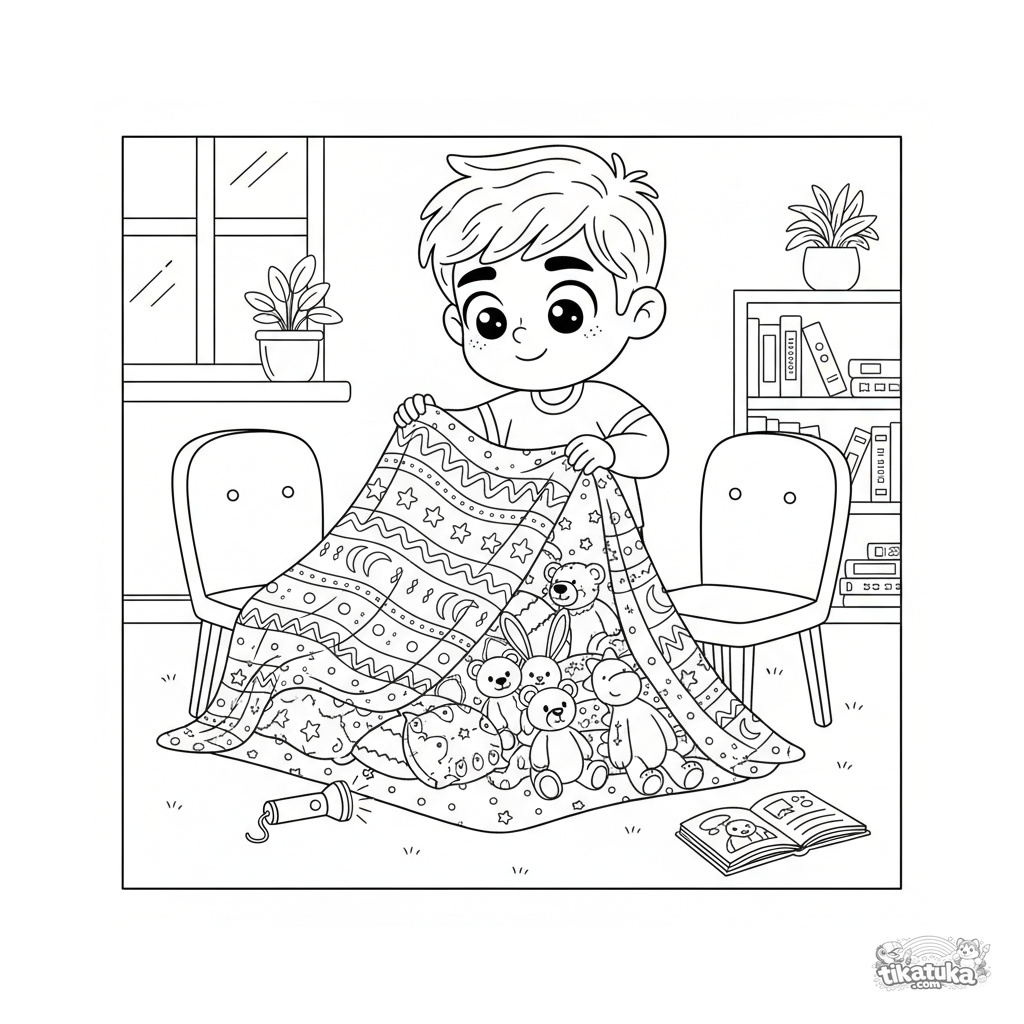 Ausmalbild eines Jungen, der eine gemütliche Deckenburg mit Stühlen und Kissen im Wohnzimmer baut. Für Kinder von 4 bis 6 Jahren.