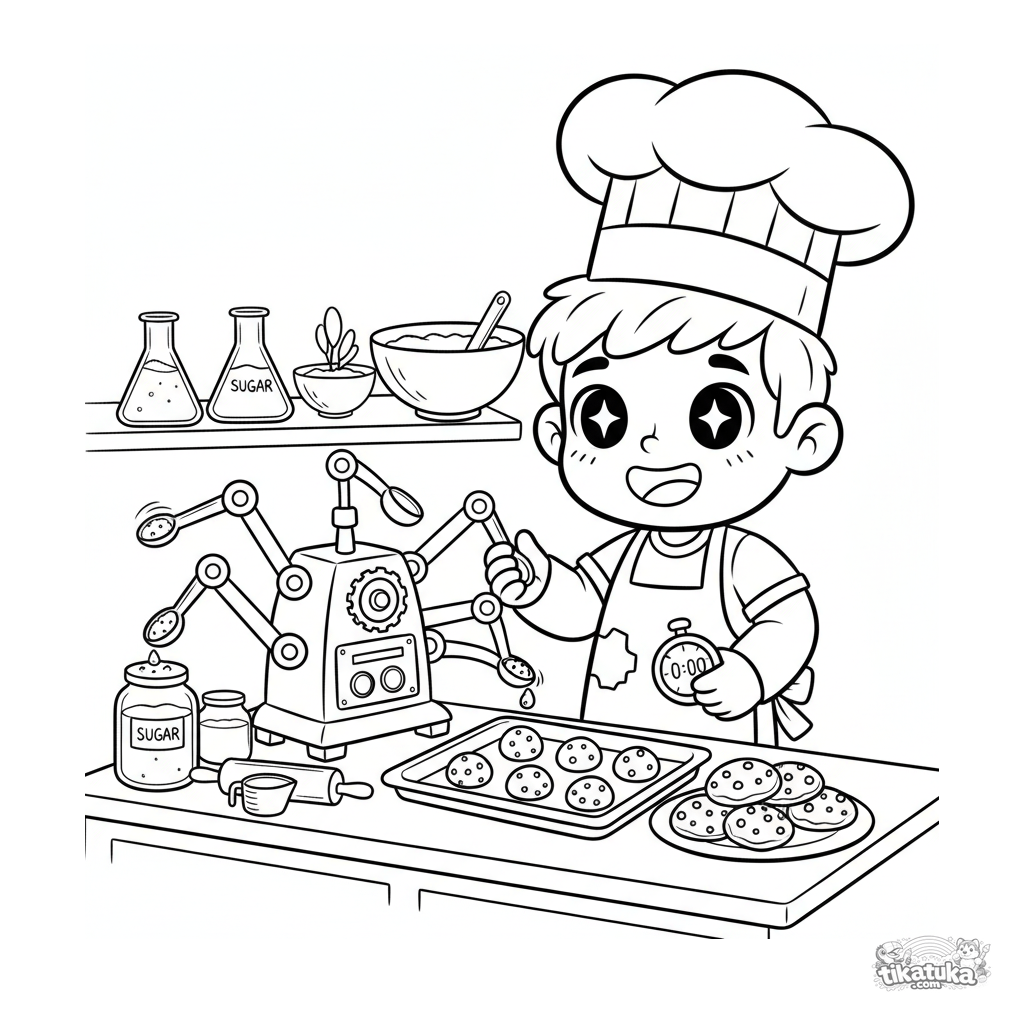 Ausmalbild für Kinder 4-6: Ein fröhlicher Junge Koch in einem Labor testet seine Erfindung, eine automatische Keksbackmaschine. Helle und klare Szene.