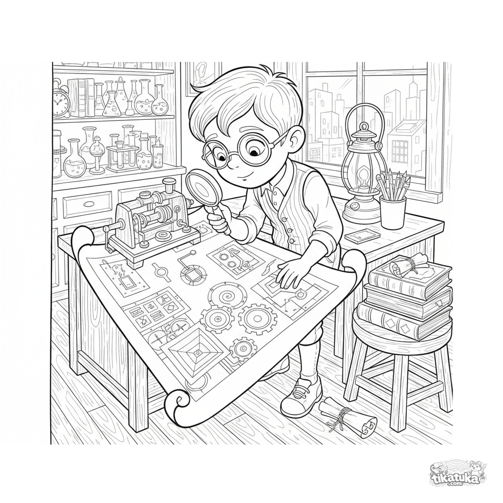 Komplexes Ausmalbild für Kinder 10-12: Ein Junge studiert einen alten Bauplan mit mysteriösen Symbolen im Labor.