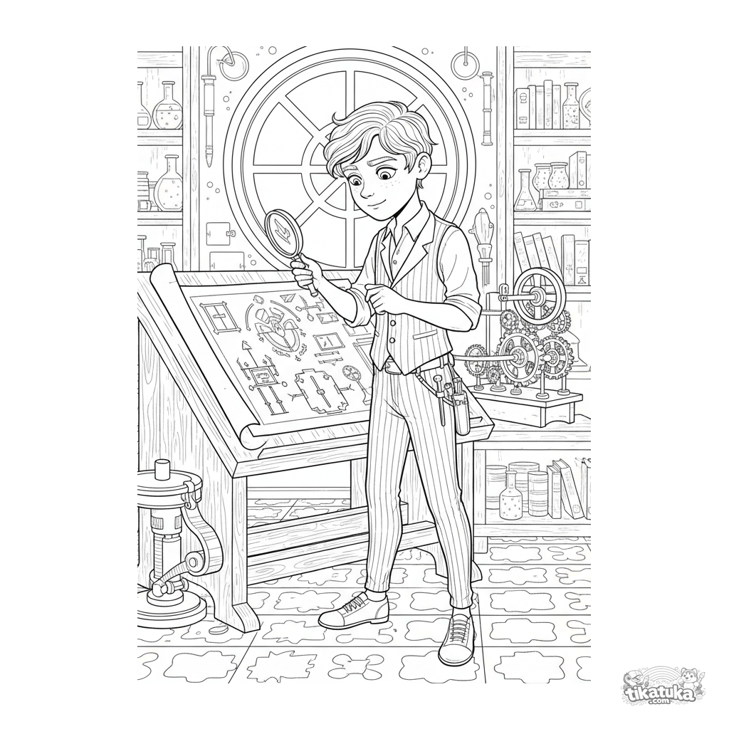 Komplexes Ausmalbild für Kinder 10-12: Ein Junge studiert in einem geheimen Labor eine Blaupause eines antiken Mechanismus. Detaillierte Szene im Stil eines alten Stichs.