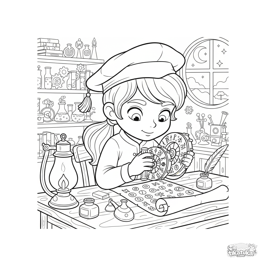 Ausmalbild für Kinder 4-6 im mittelalterlichen Stil: Ein Junge mit Gelehrtenhut entschlüsselt eine alte Schriftrolle im Geheimlabor. Dekorative Details.