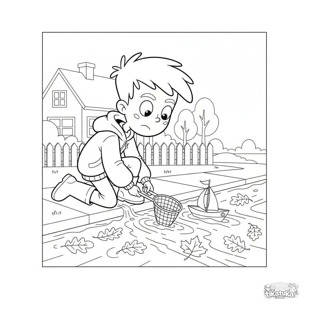 Ausmalbild für Kinder 7-9 Jahre: ein Junge in Gummistiefeln fischt mit einem Kescher Herbstblätter in einem Rinnsal. Vorstellungsspiel-Szene mit mäßigem Detail.