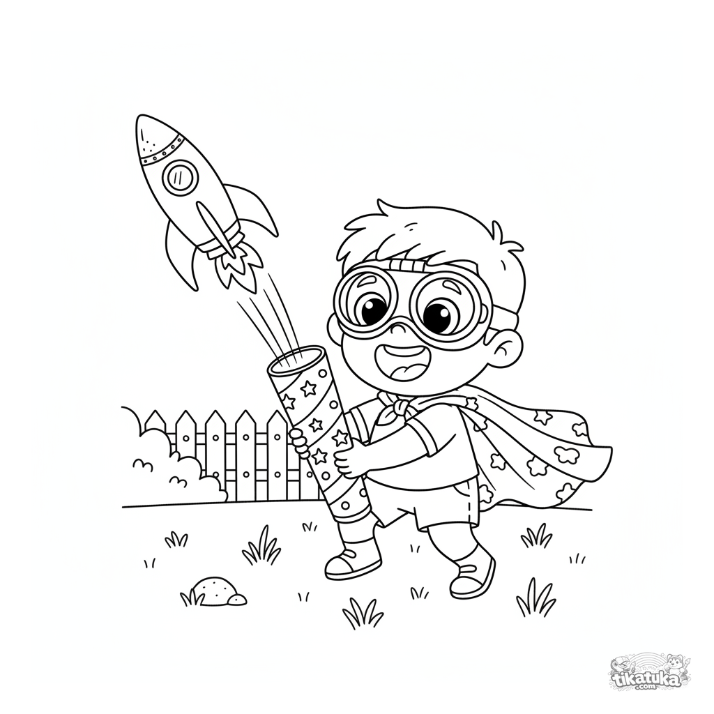 Ausmalbild für Jungen 4-6: Ein junger Erfinder mit Umhang und Brille startet eine selbstgemachte Korkrakete. Eine dynamische und lustige Szene zum Ausmalen.