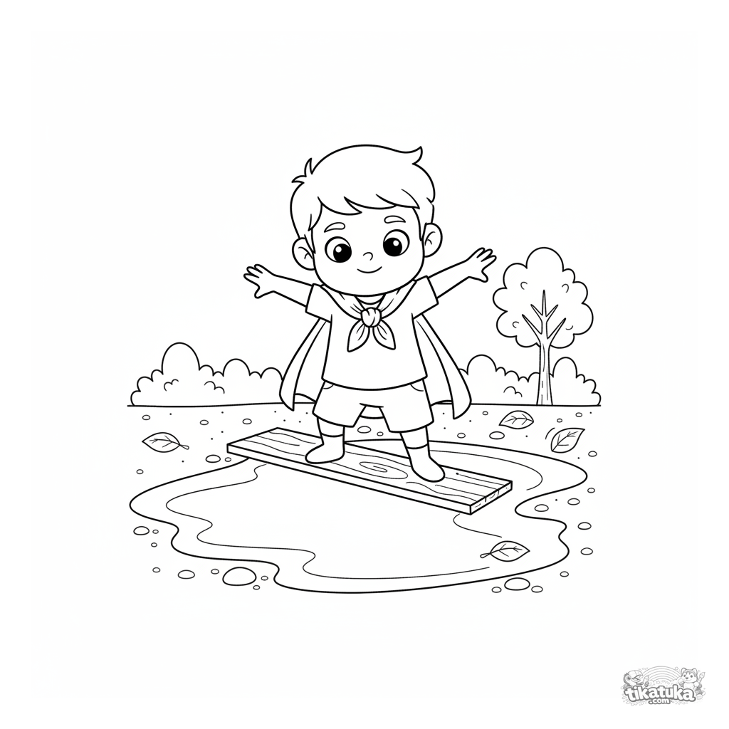 Ausmalbild für Jungen: Ein Kind mit Umhang balanciert auf einem Brett über einer Pfütze. Für 4-6 Jahre, eine Kindheitsabenteuerszene.