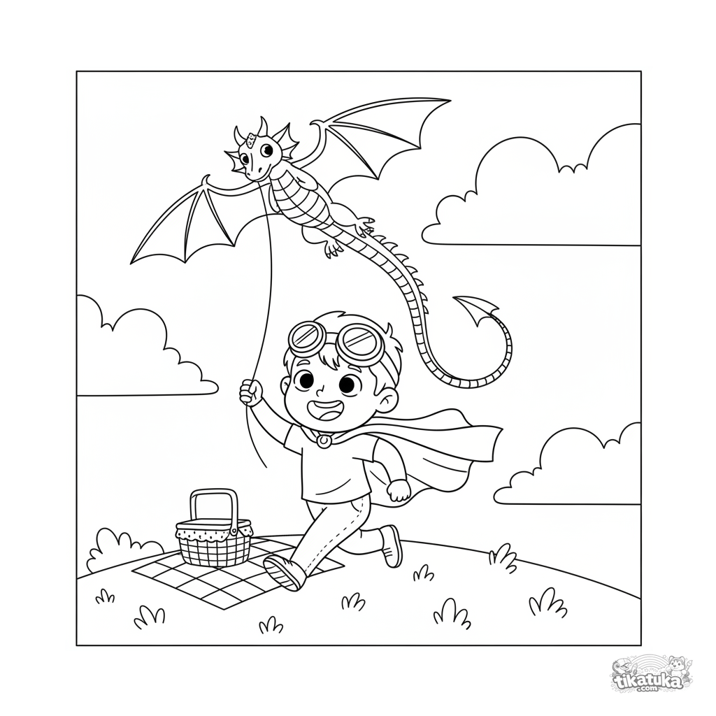 Ausmalbild eines Jungen mit Umhang, der einen Drachen in Drachenform auf einem windigen Hügel fliegen lässt. Für Kinder von 3 bis 6 Jahren.