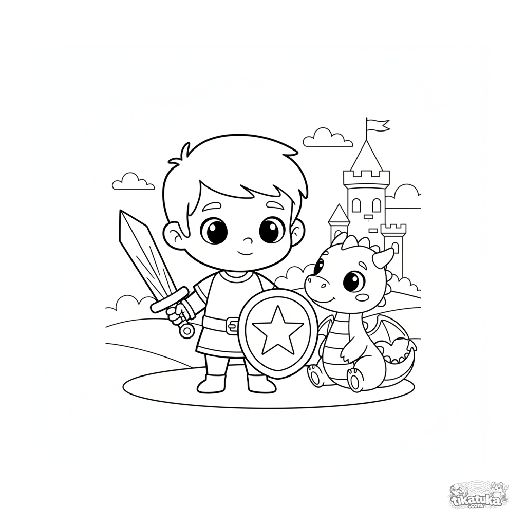 Ausmalbild für Jungen 4-6: Ein tapferer junger Ritter mit Holzschwert und Schild steht neben einem freundlichen Drachen. Abenteuerliche Szene.