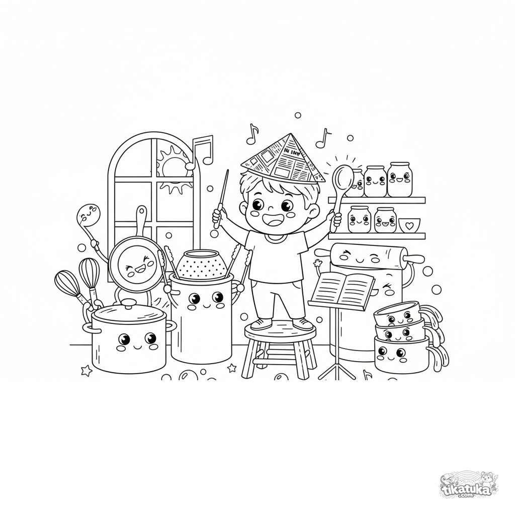 Ausmalbild eines Jungen mit einer Zeitungshut, der ein fröhliches Orchester aus Töpfen und Küchenutensilien dirigiert. Für Kinder von 5 bis 8 Jahren.
