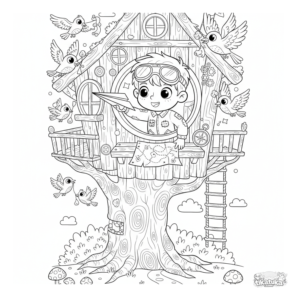 Ausmalbild eines Jungen, der ein Papierflugzeug aus einem Baumhaus wirft. Für Kinder von 6-9 Jahren. Details: Fliegerbrille, Karte, Kompass.