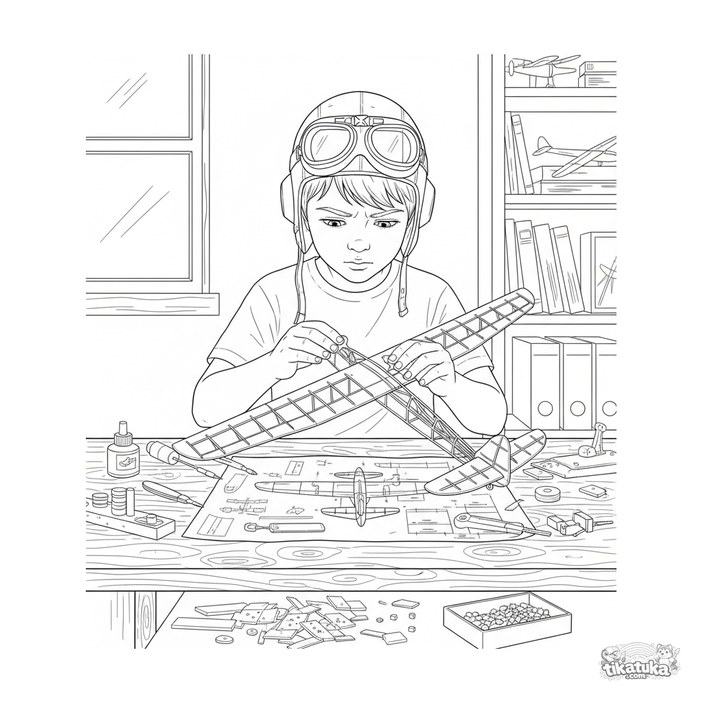 Ausmalbild für Jungen 7-12: ein Junge mit Fliegerhelm baut konzentriert ein Balsaholzgleitermodell an einer Werkbank. Detaillierte Szene mit Bauplänen und Werkzeugen.
