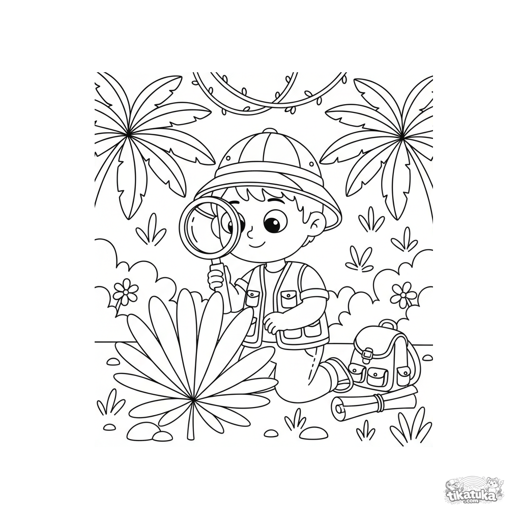 Ausmalbild eines neugierigen Jungenforschers, der mit einer Lupe ein Riesenblatt im Dschungel untersucht. Für Kinder von 3-6 Jahren.