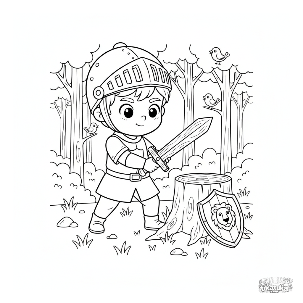Ausmalbild für Jungen 4-6: Ein junger Ritter in einer einfachen Tunika übt mit einem Holzschwert an einem moosigen Baumstumpf auf einer Waldlichtung.