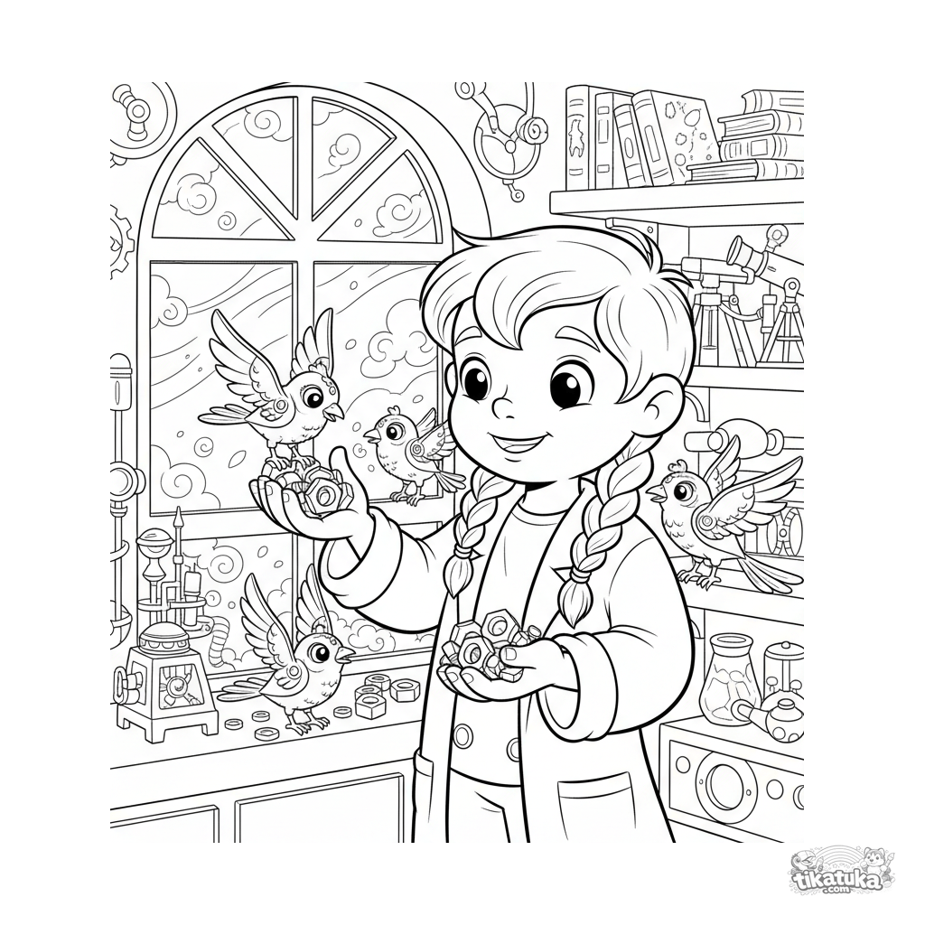 Ausmalbild für Jugendliche 7-9: Ein Erfinderjunge in einem geheimen Labor füttert winzige mechanische Uhrwerkvögel aus seiner Hand.
